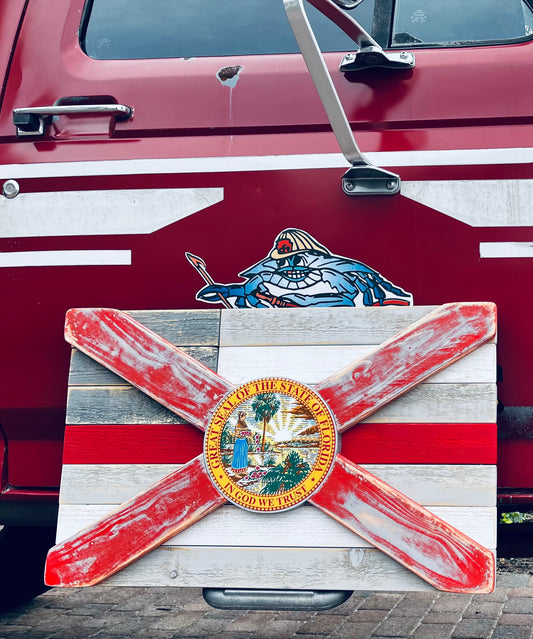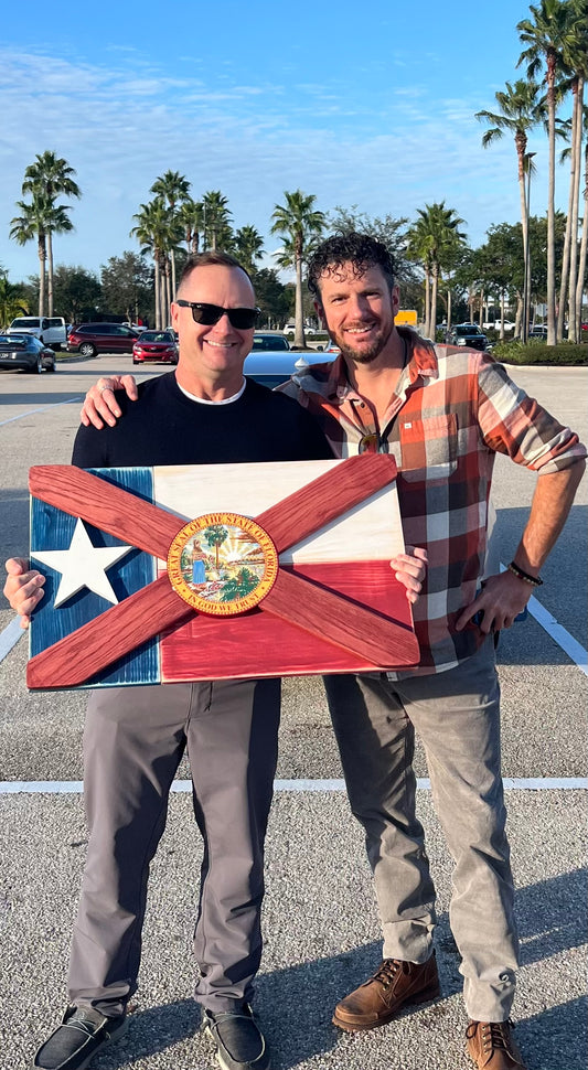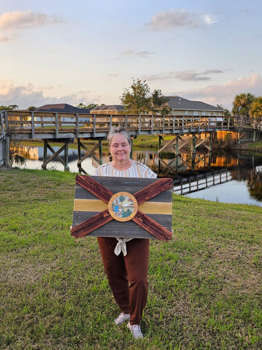 Elevate your space with a one-of-a-kind, handcrafted solid wood Florida flag, and bring a piece of the Sunshine State's artistry into your life.