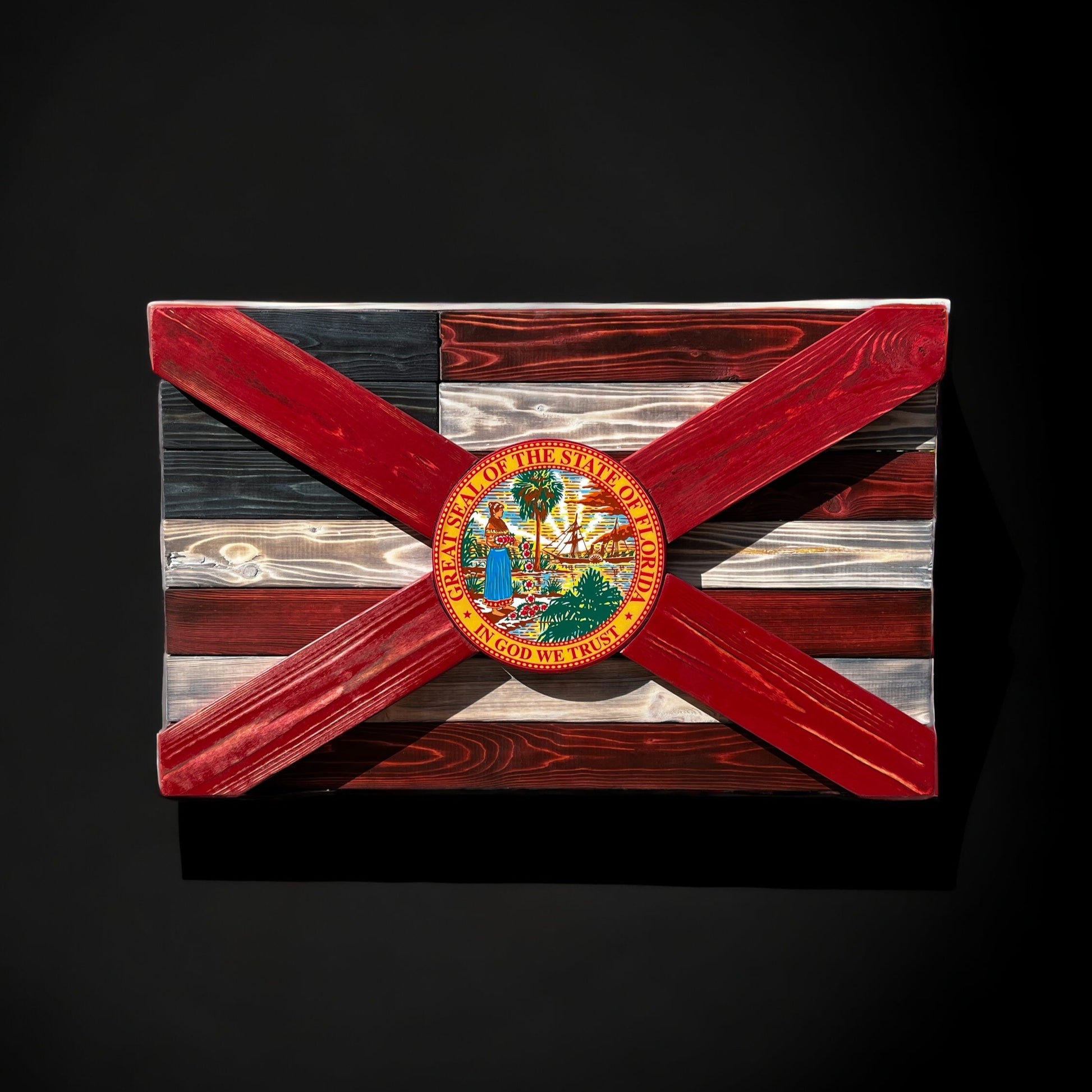 Let your patriotism fly with this unique mashup of Old Glory and the Florida flag! Crafted from wood, this rustic United State of Florida Flag is perfect for any Floridian who wants to show off their state pride!