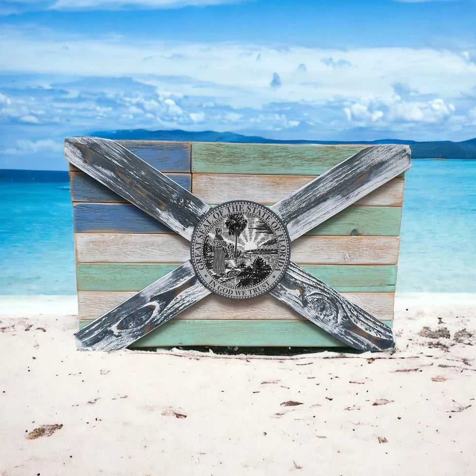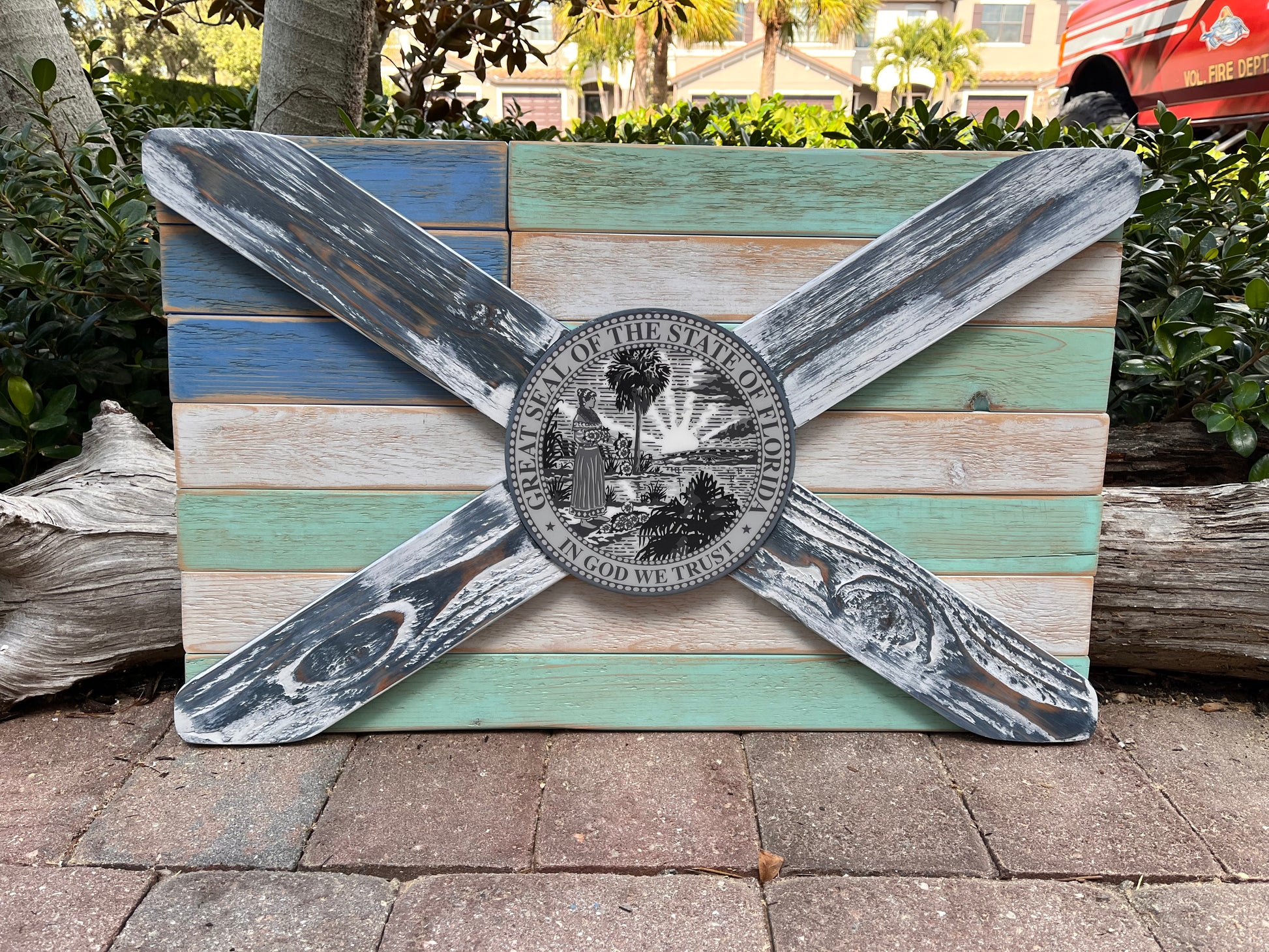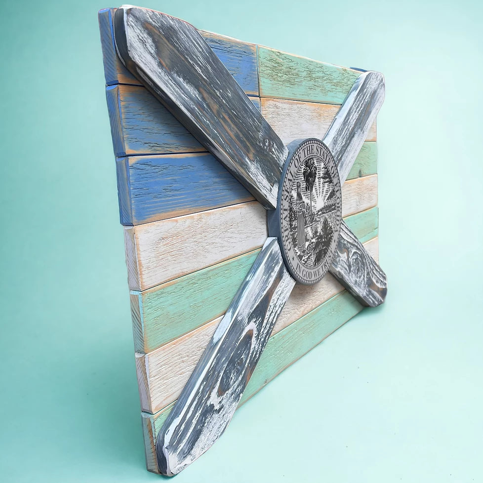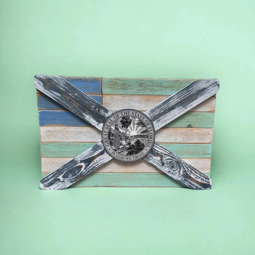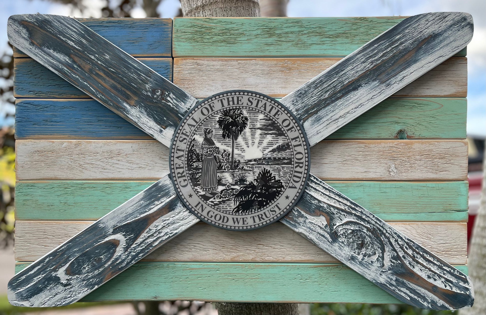 Show your Florida AND American pride with this one-of-a-kind flag! Made out of sturdy wood, the Florica Marathon flag features a vibrant blue and sea green American flag topped with a weathered white Florida seal and iconic diagonal cross. Ready, set, wave!