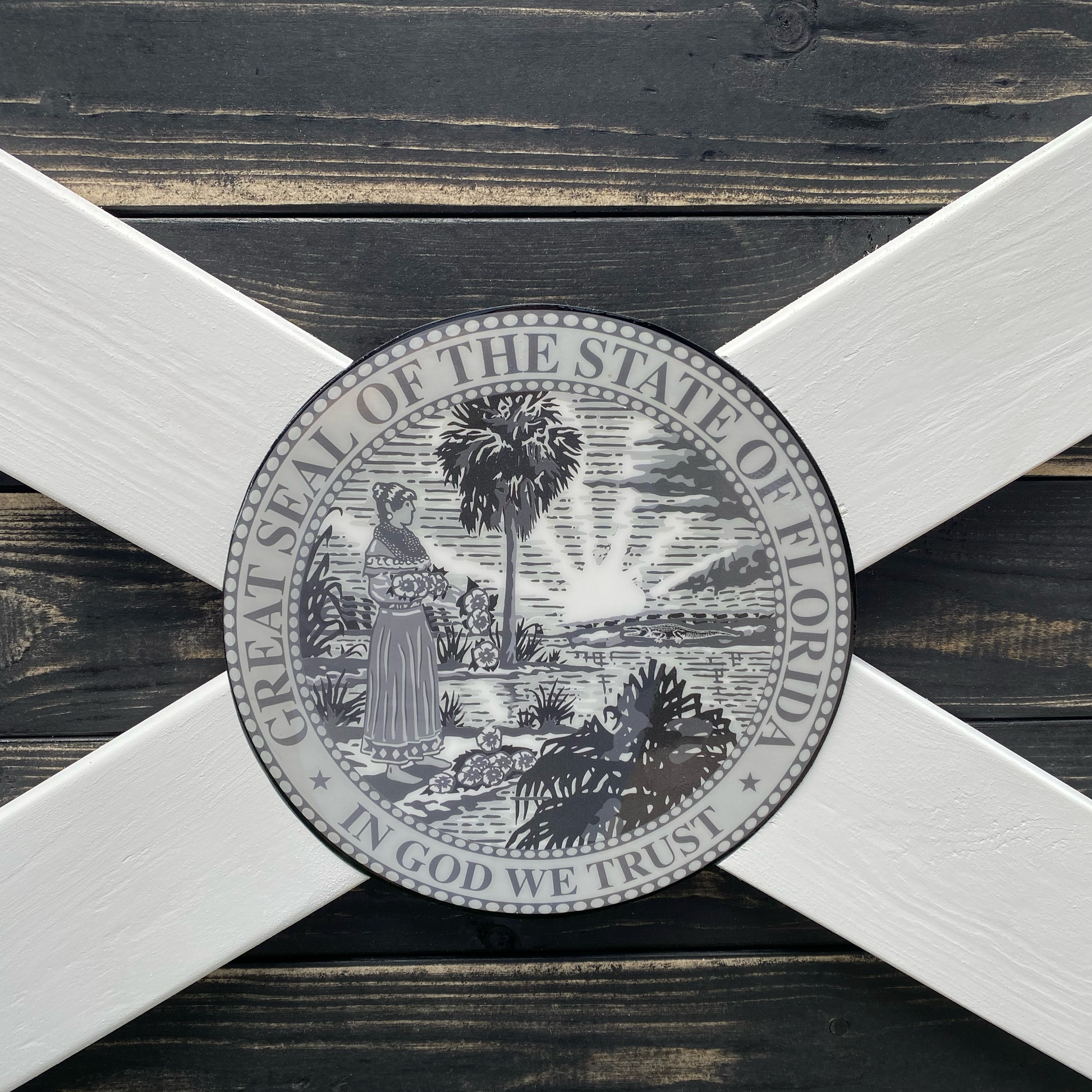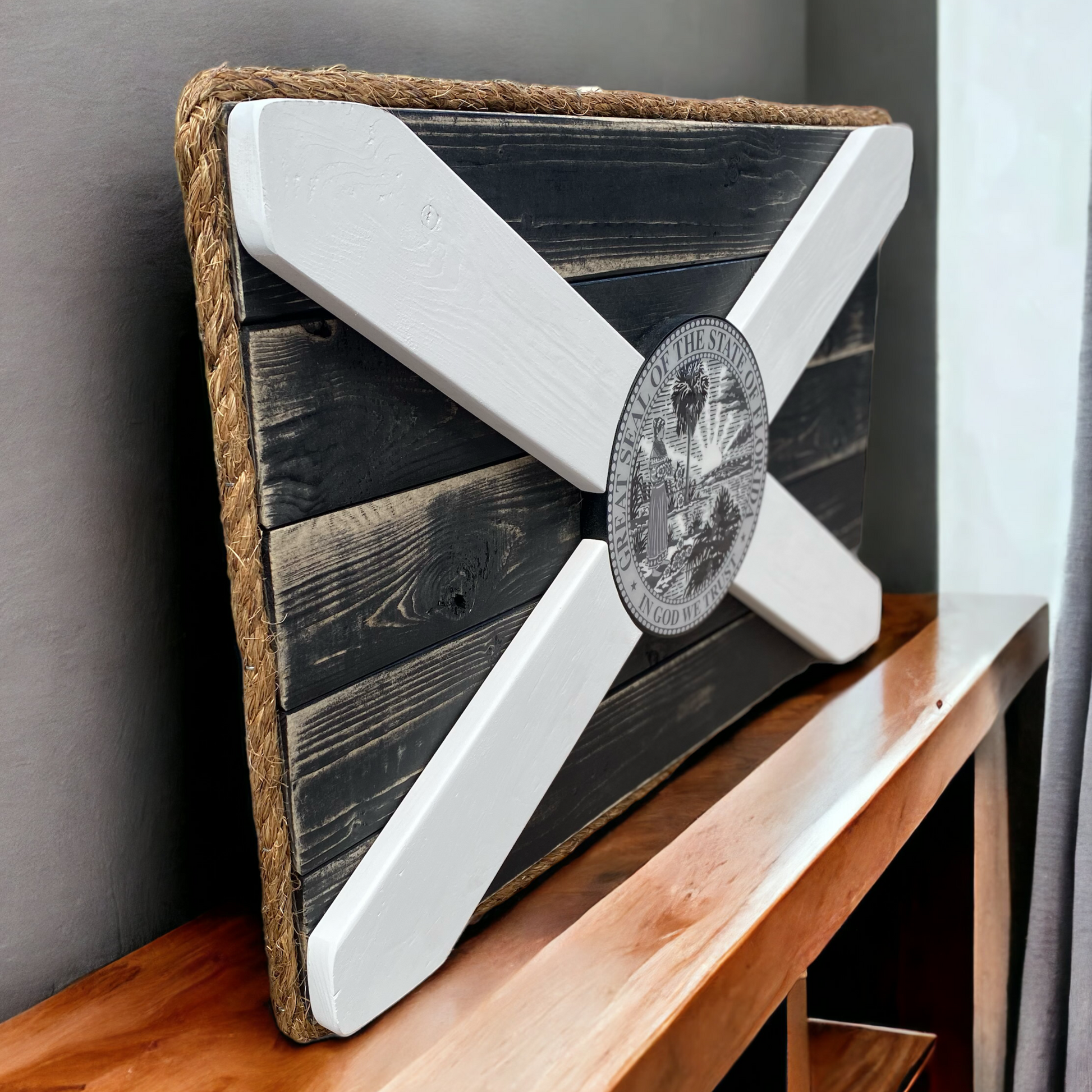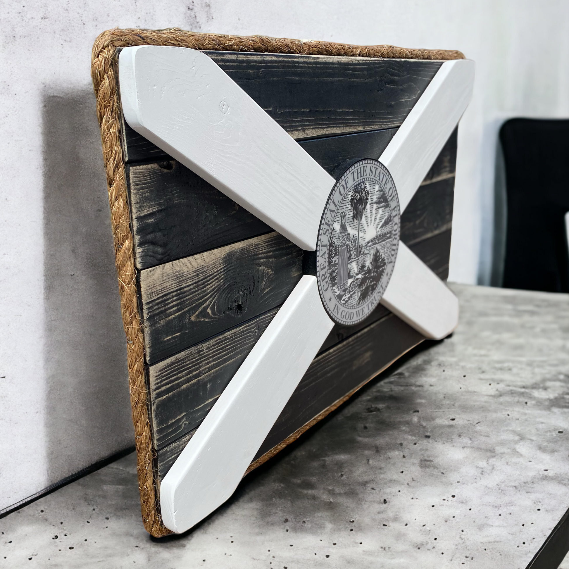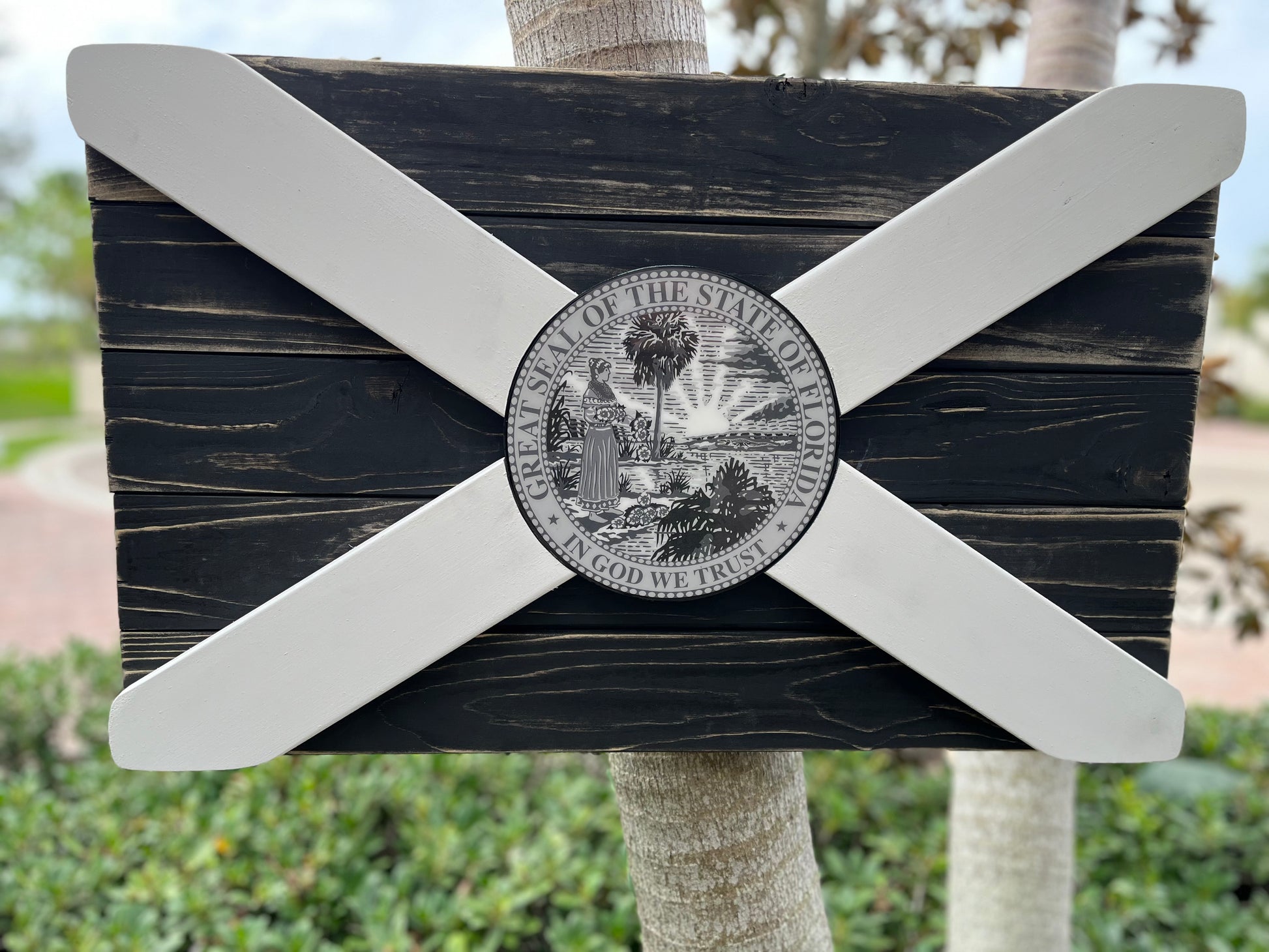 Show your Florida pride with the Gaspar flag! This one-of-a-kind flag is cut from white cedar and poplar wood, and is designed to be as tough as the locals with a charcoal black and white paint job that can take even the most extreme Florida weather. Add a bit of local flavor to your decor today!
