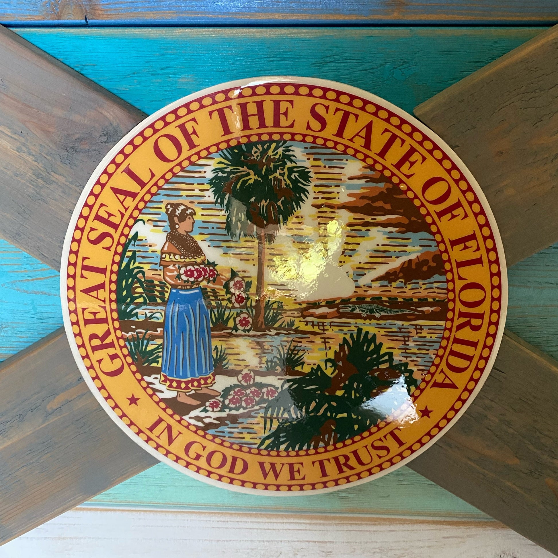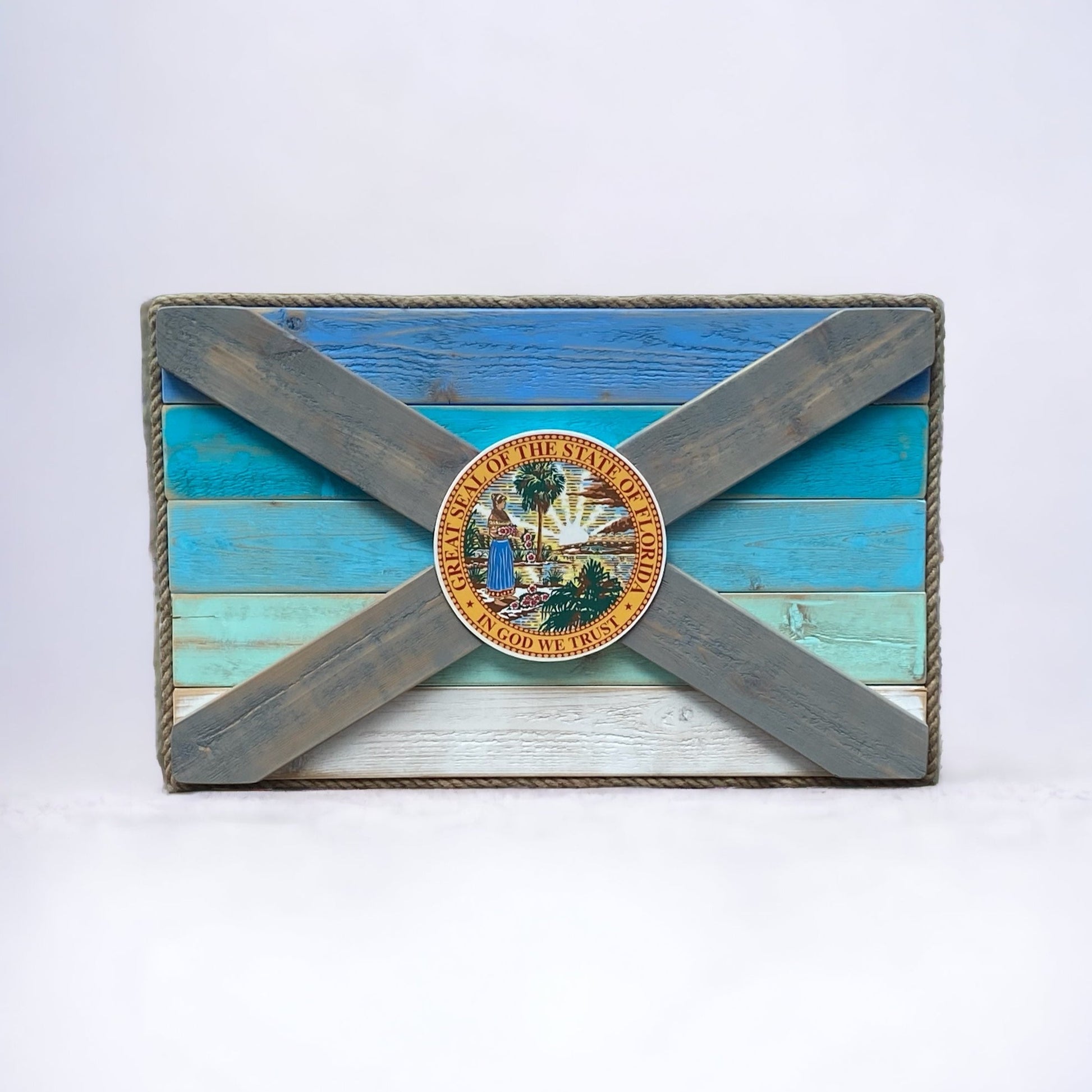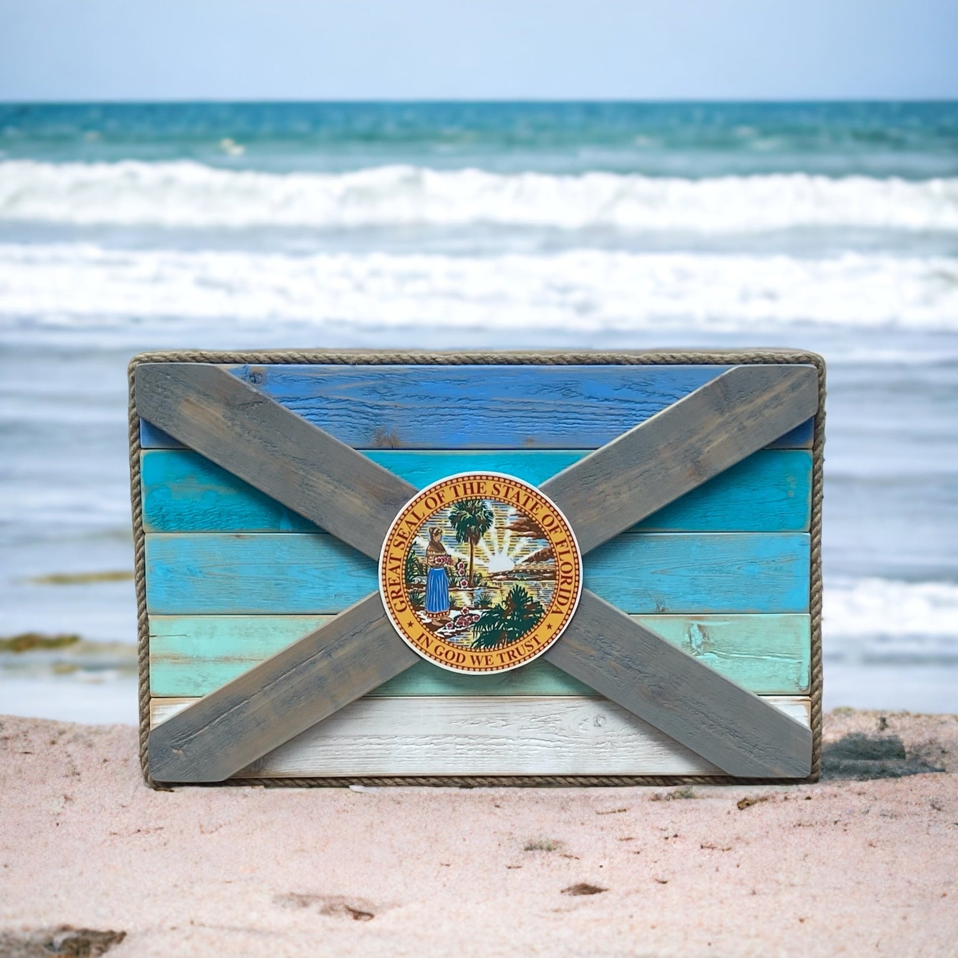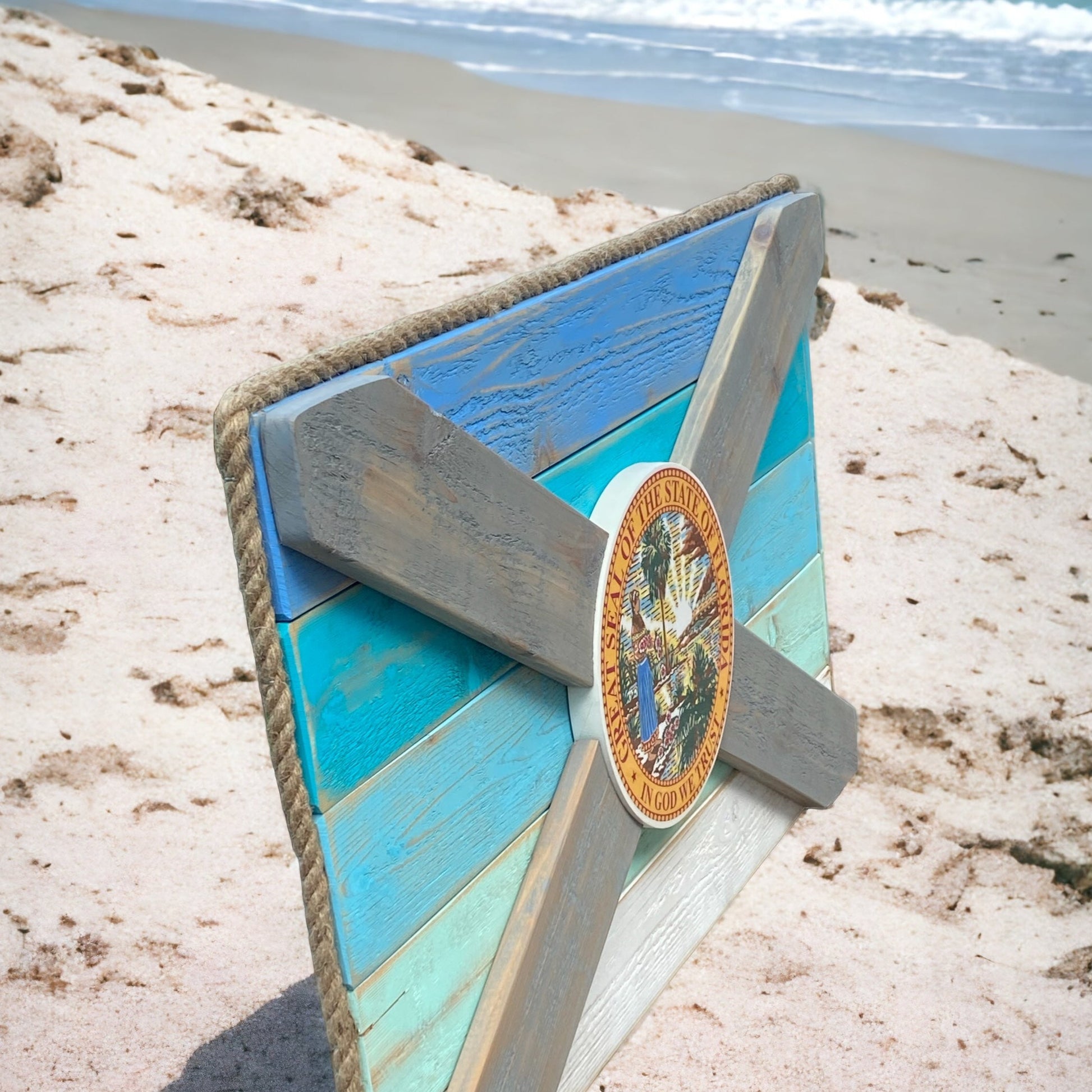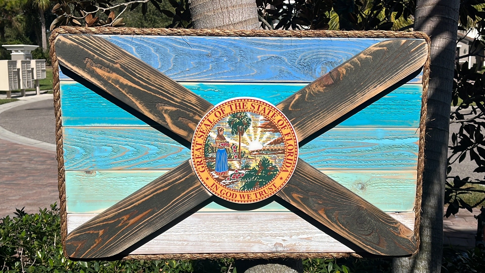 Old Salt is made with a full color seal, white cedar and poplar wood, painted in coastal shades, designed to withstand Florida's extreme outdoor elements. A crystal clear, high-gloss two-part epoxy resin-coated seal comes standard. Hang out of direct sunlight and exposure to elements (as you would a TV on your lanai).