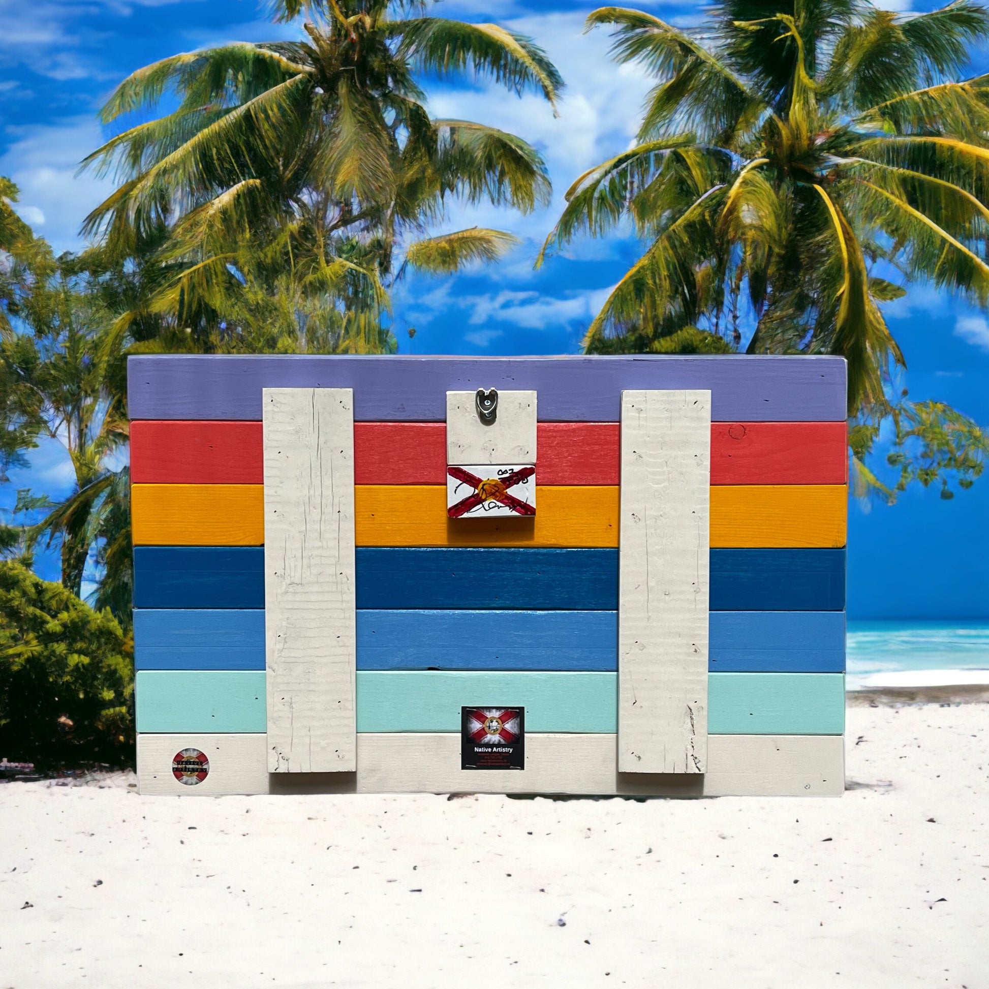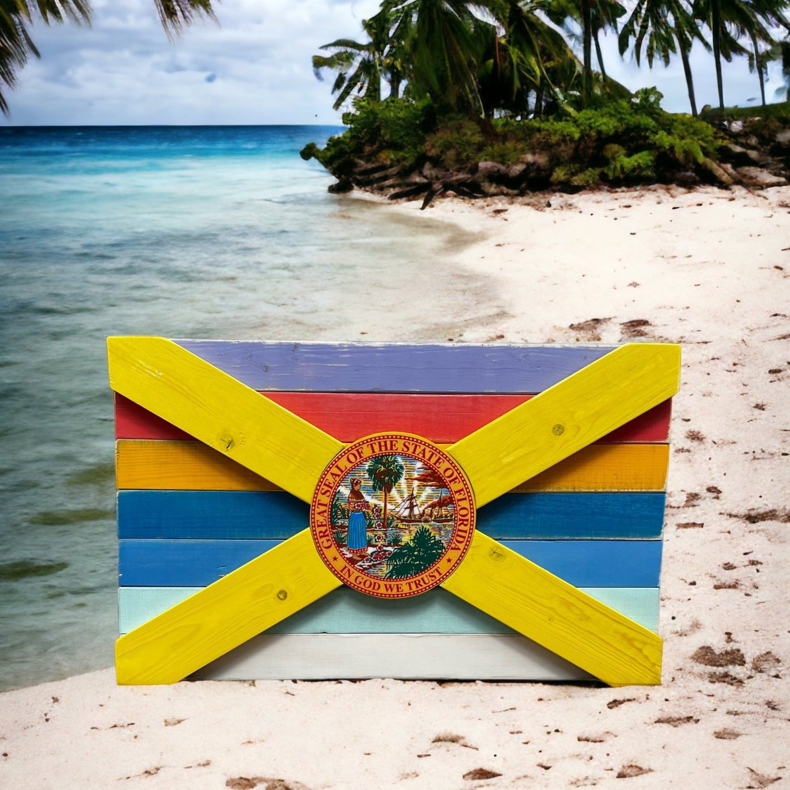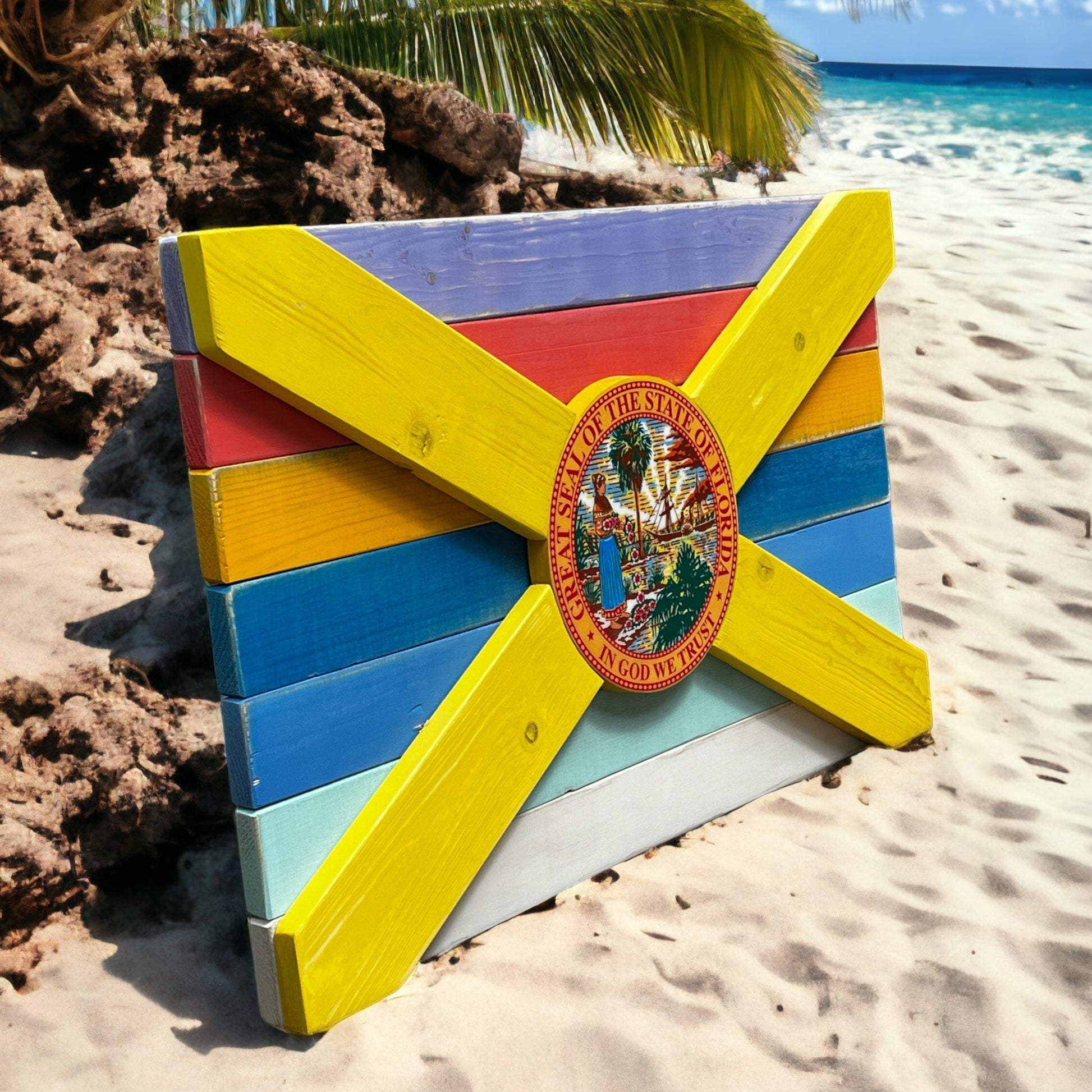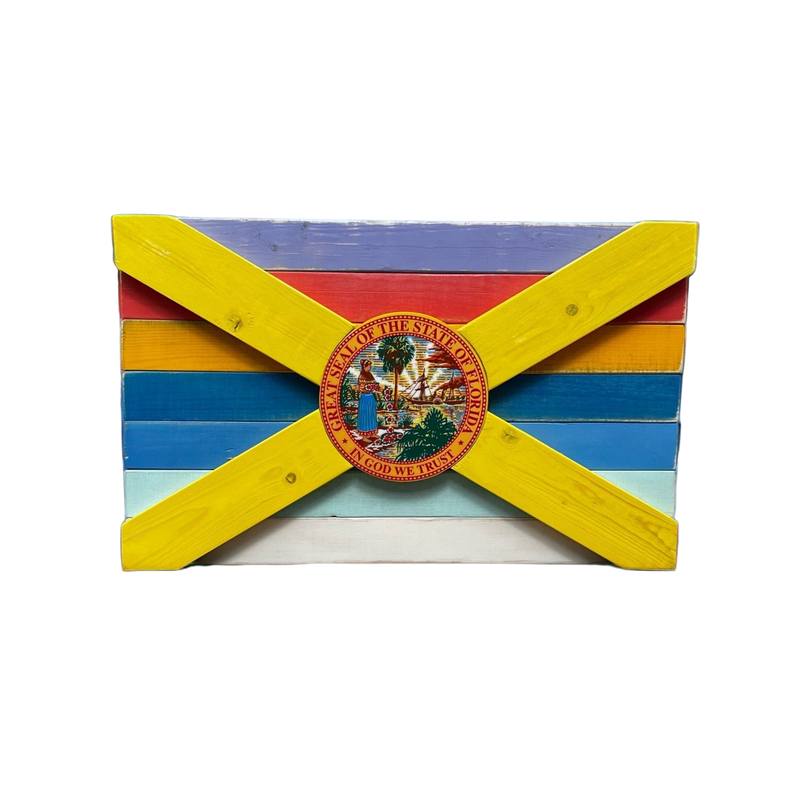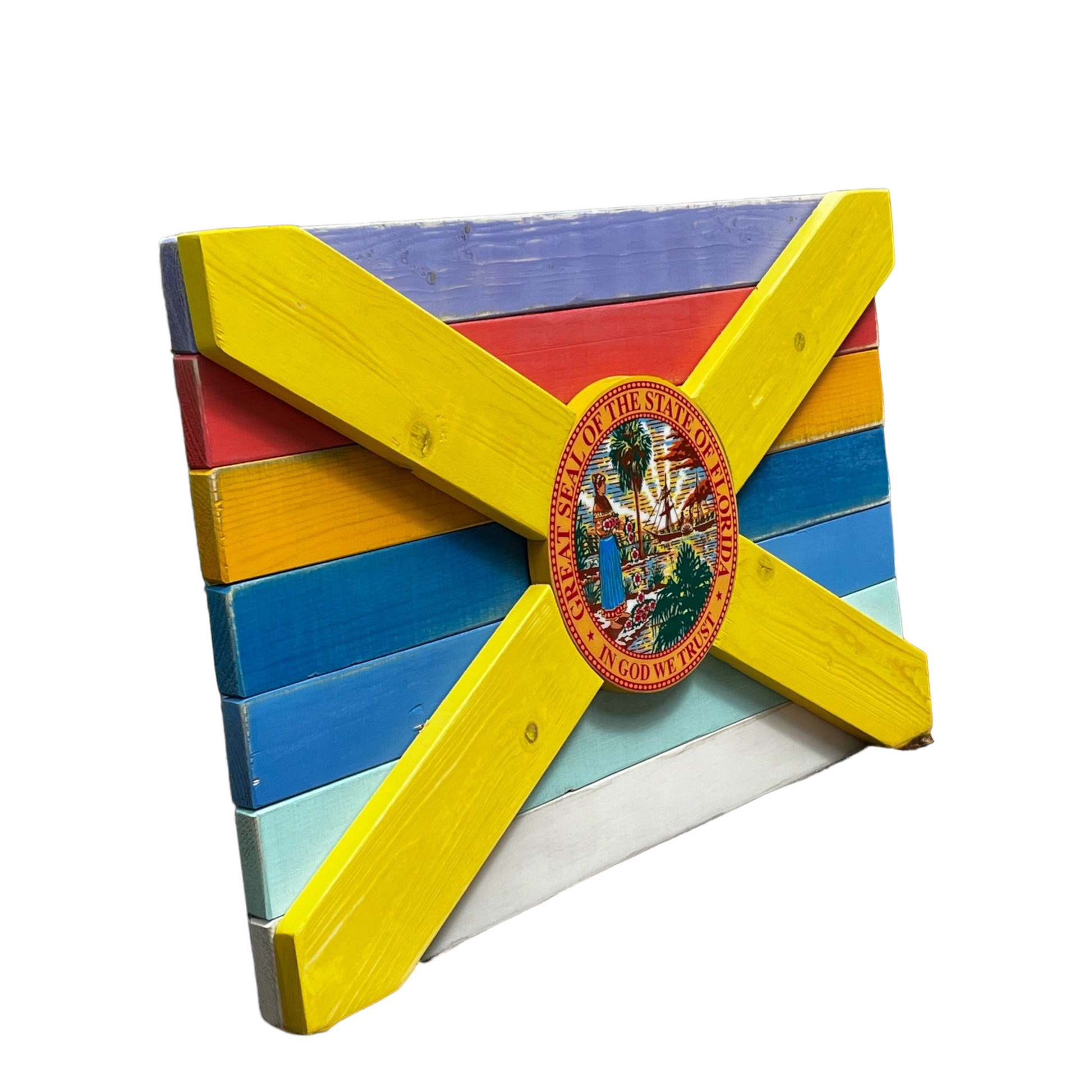 Bring a little of the islands to your interior decor with our Sunshine State of Mind Florida flag – a wood-crafted Florida flag with a vibrant yellow cross and tropical colors that'll inject a bit of the Sunshine State wherever it is displayed. Let the fun begin!