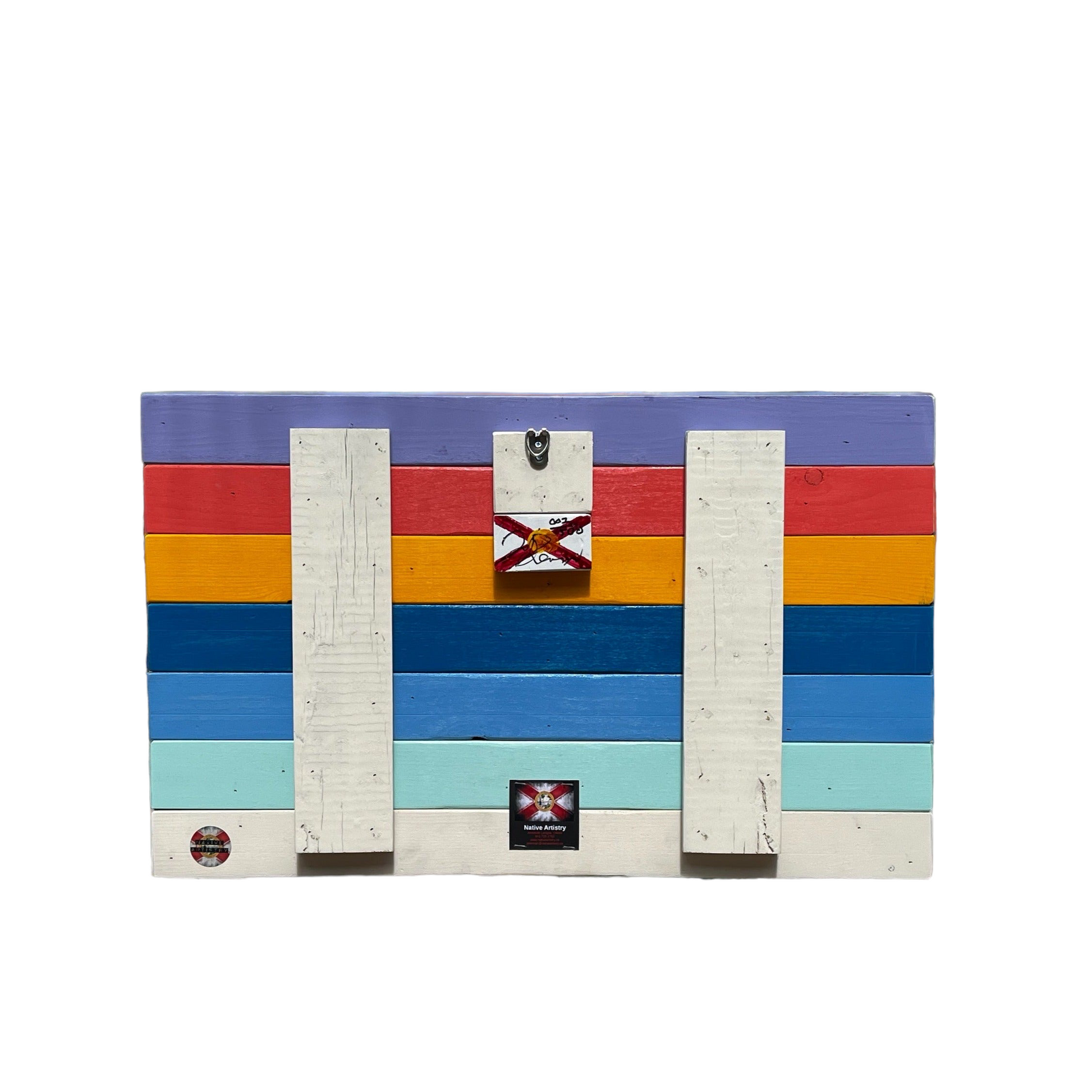 Sunshine State of Mind is made with white cedar and poplar wood, painted in vintage island shades, and designed to withstand Florida's extreme outdoor elements. A crystal clear, high-gloss two-part epoxy resin-coated seal comes standard. Hang out of direct sunlight and exposure to elements (as you would a TV on your lanai).