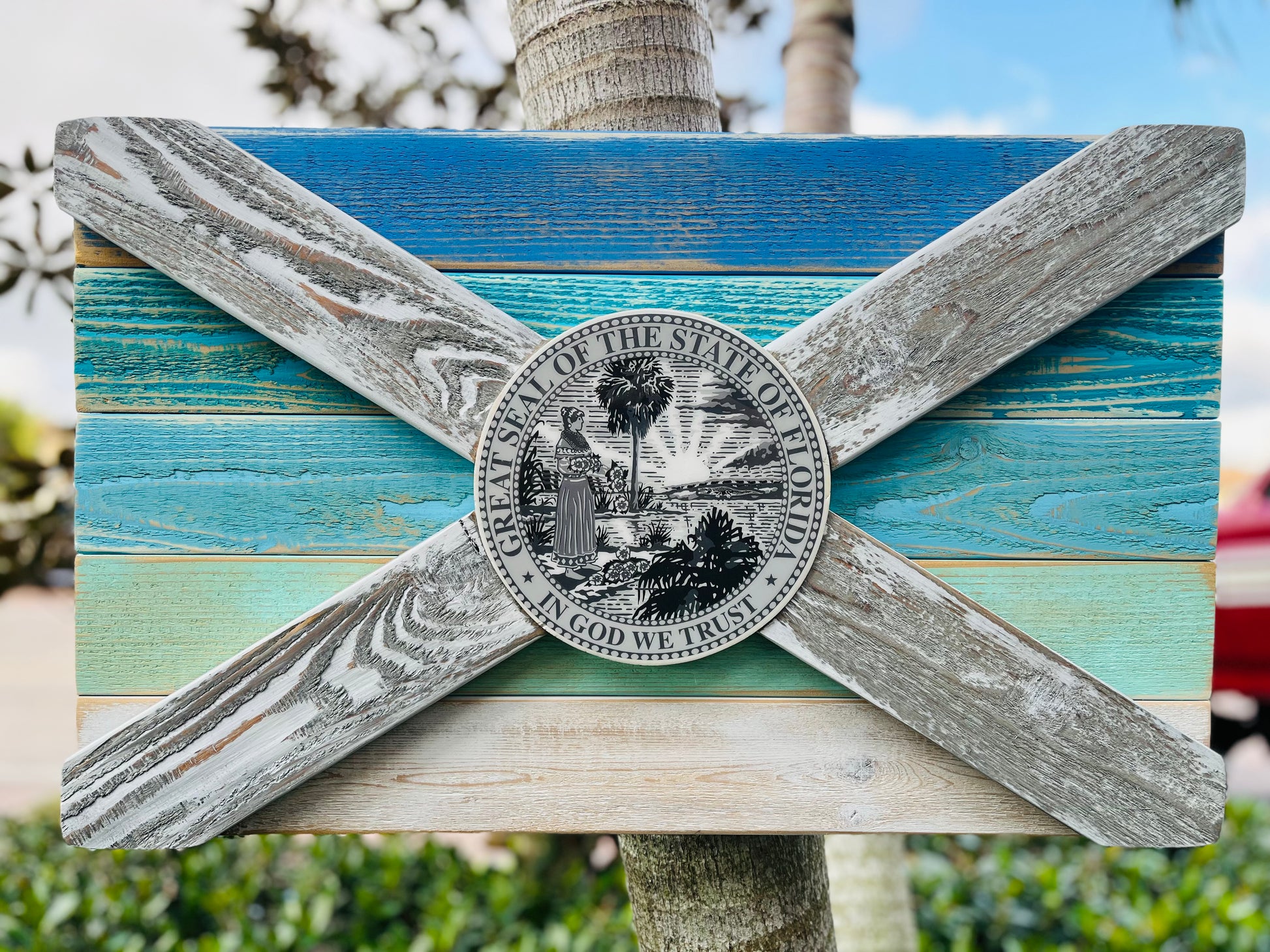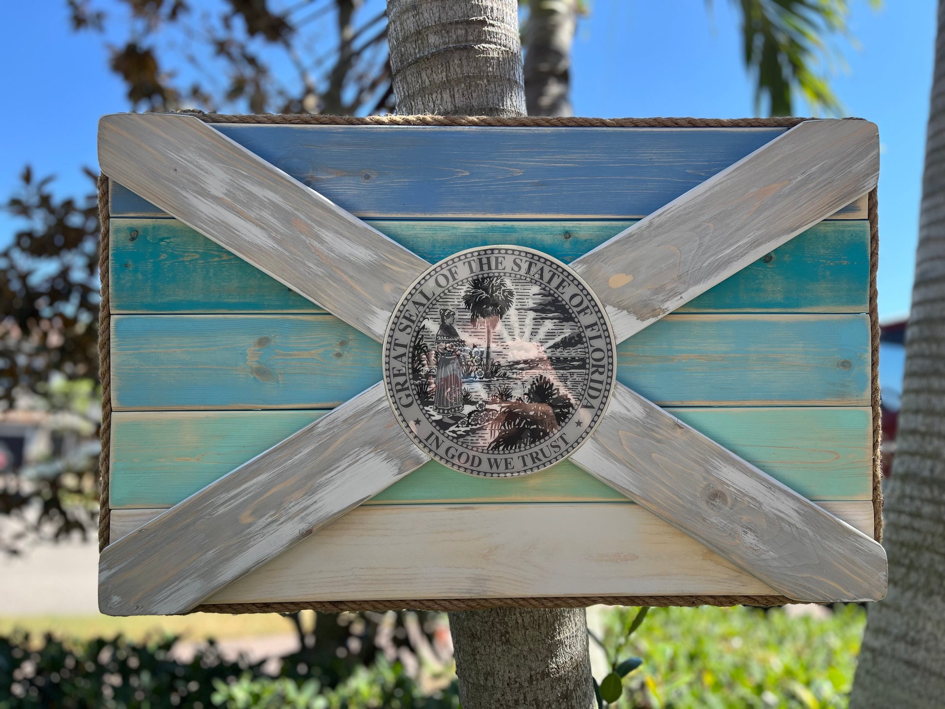 Elevate your space with the Bougie Beach Solid Wood Florida flag, meticulously crafted from durable pine. The coastal-inspired hues of blue, white, and sea green are beautifully complemented by a classic black and white seal. Engineered to withstand Florida's harsh outdoor elements, this flag features a protective two-part epoxy resin coating for long-lasting durability. Make a statement with Bougie Beach and add a touch of coastal charm to any room.