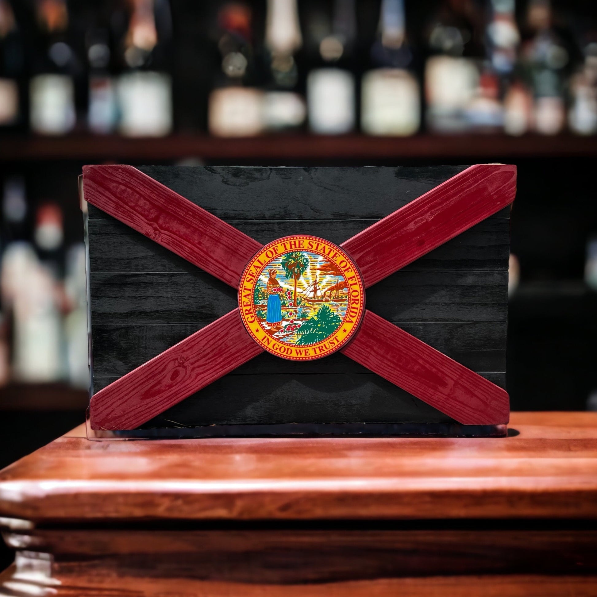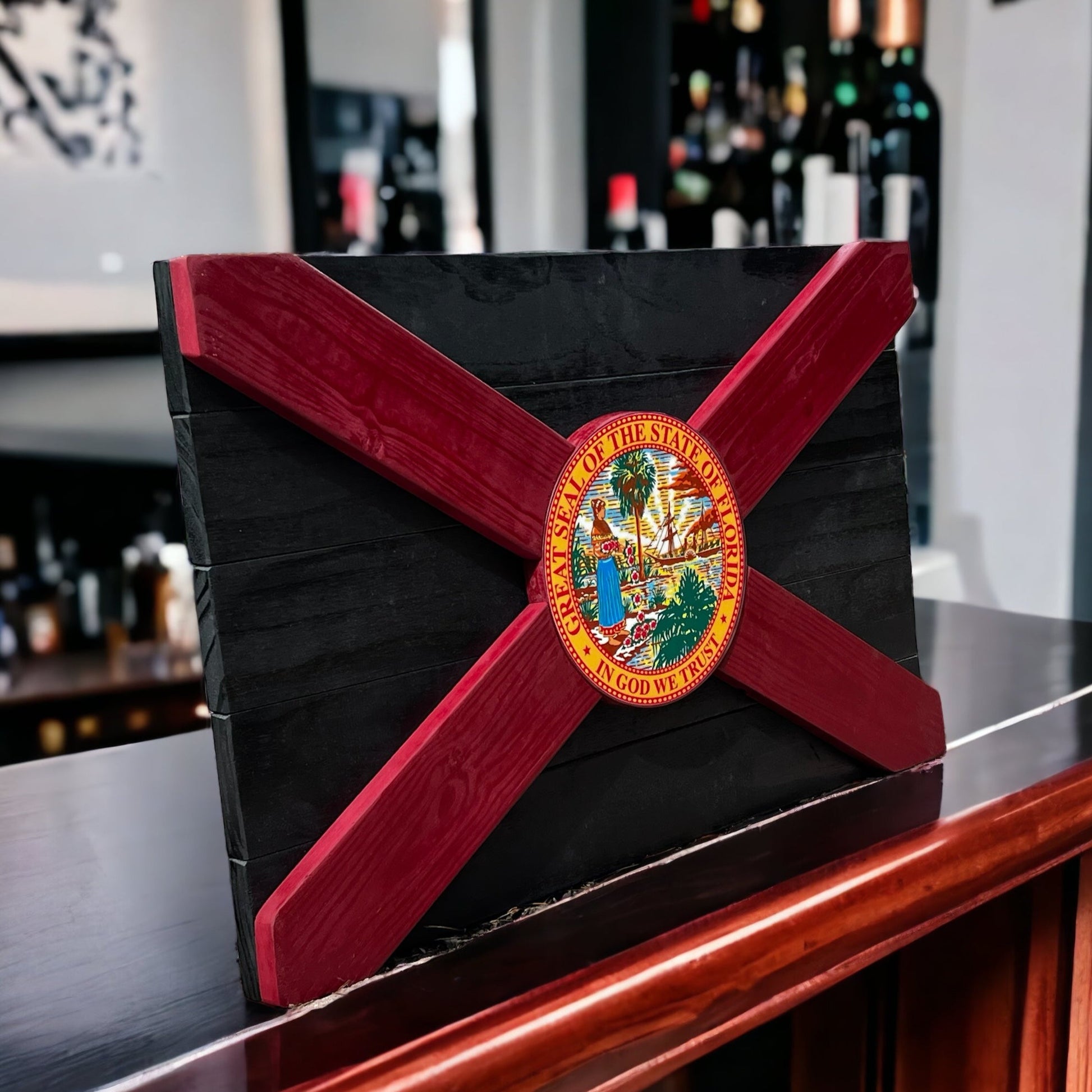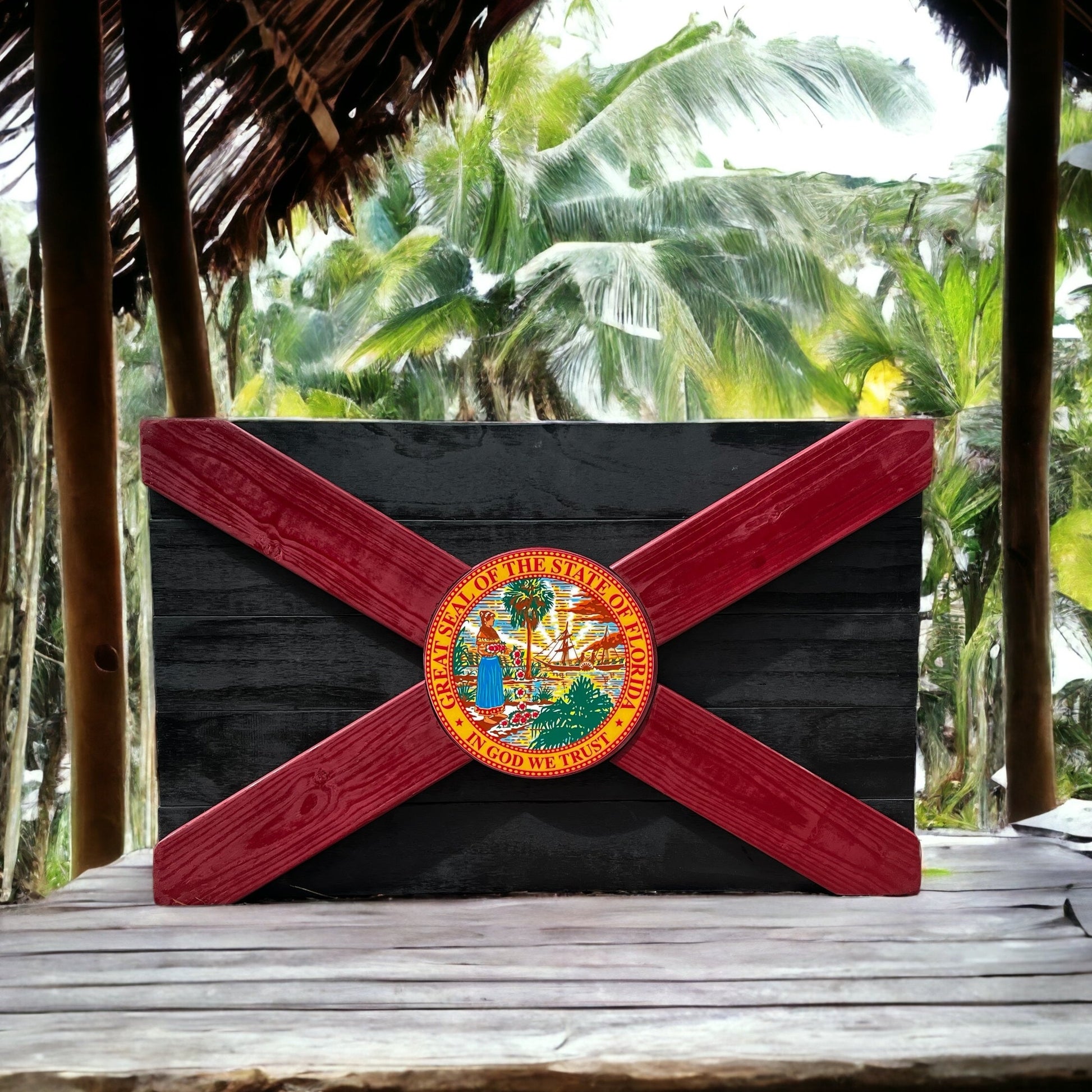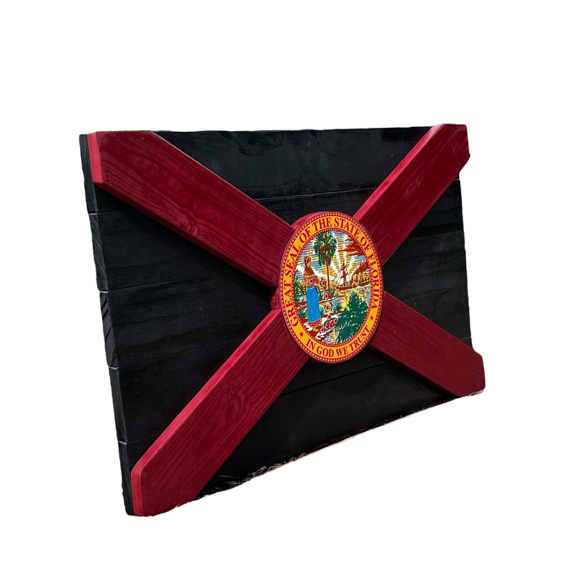 Step up your style game with this Tomahawk Florida flag! Made with white cedar and poplar wood with a color center seal, painted in black and garnet, this is unique Florida decor. Show off the state you love!