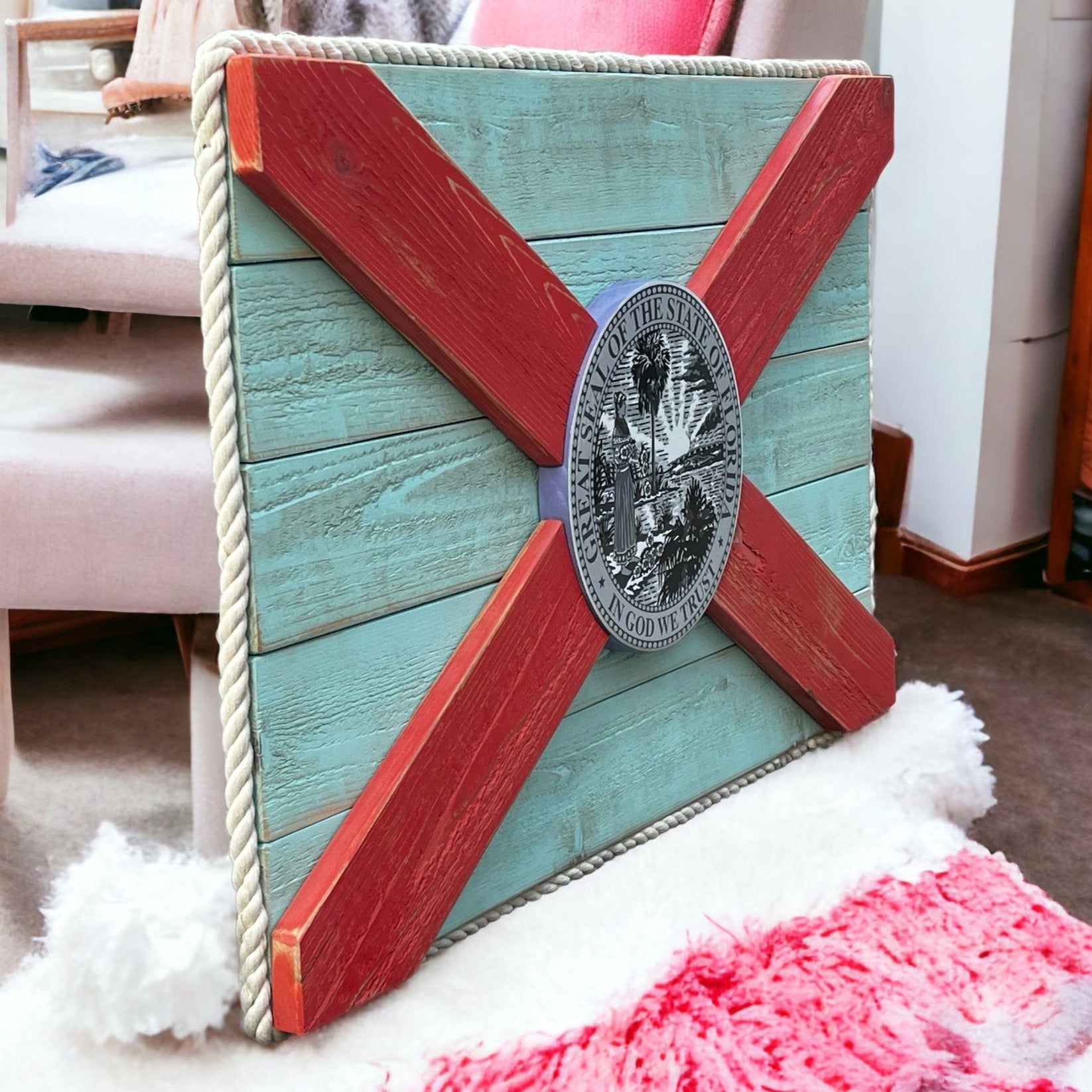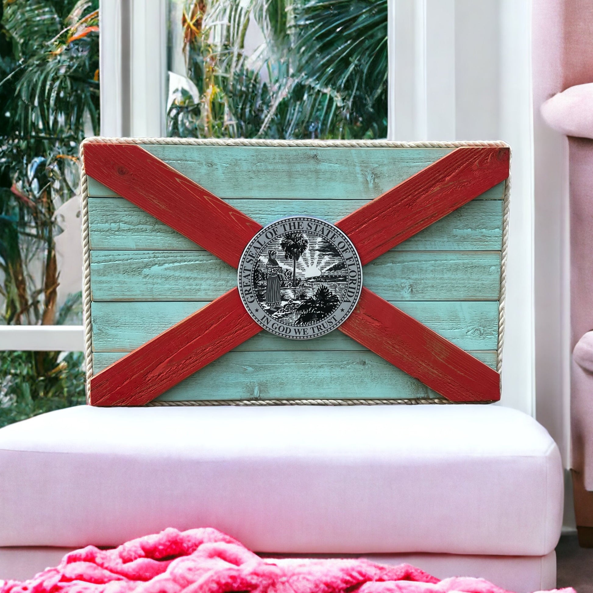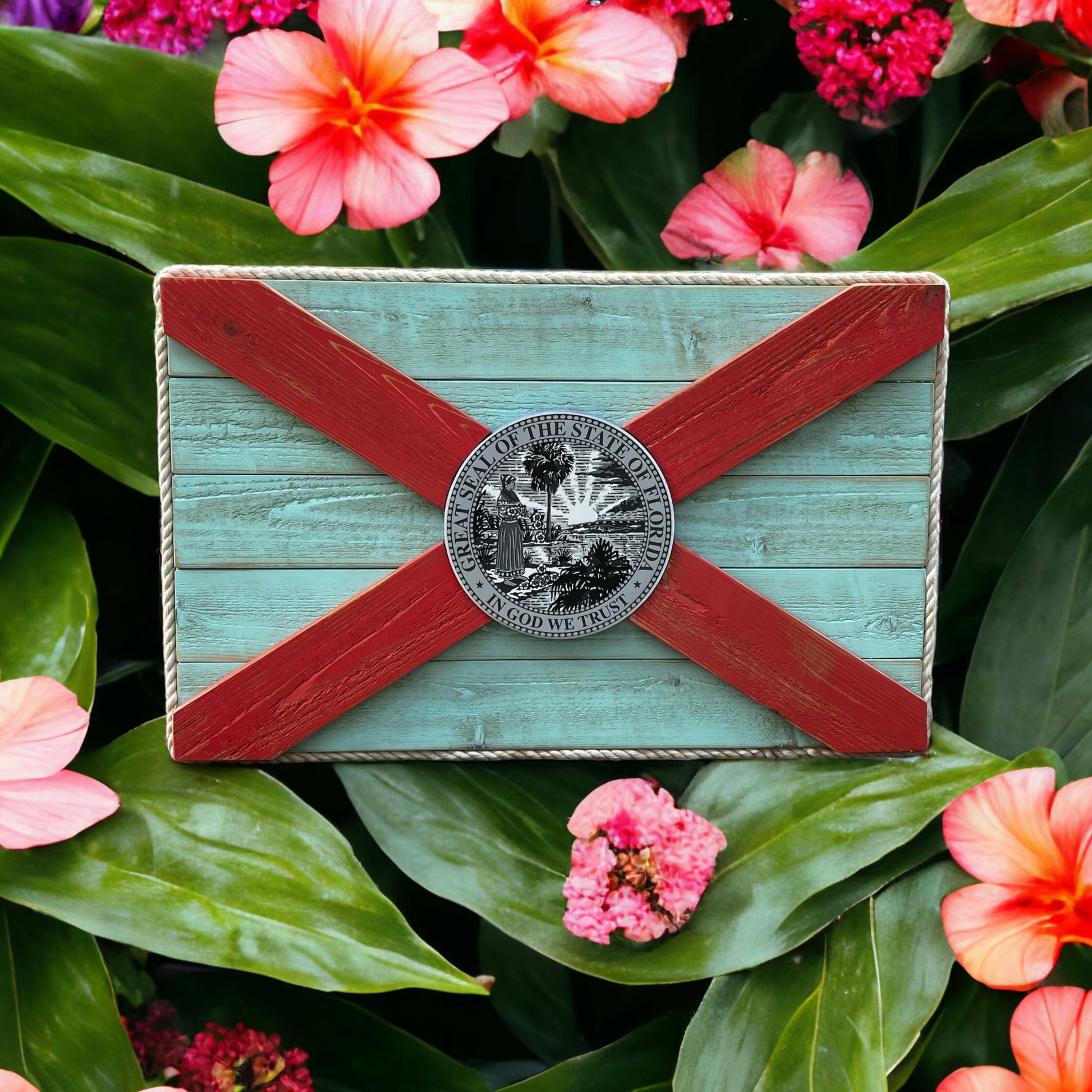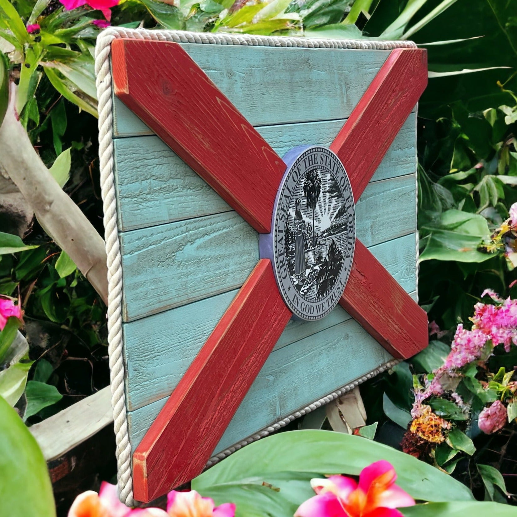Relax in style with TropicGal, a Florida flag made from white cedar wood, and painted with a blend of colors so vibrant, it'll turn your patio into paradise! Show off your state pride with a piece that truly captures the beauty of the Sunshine State.