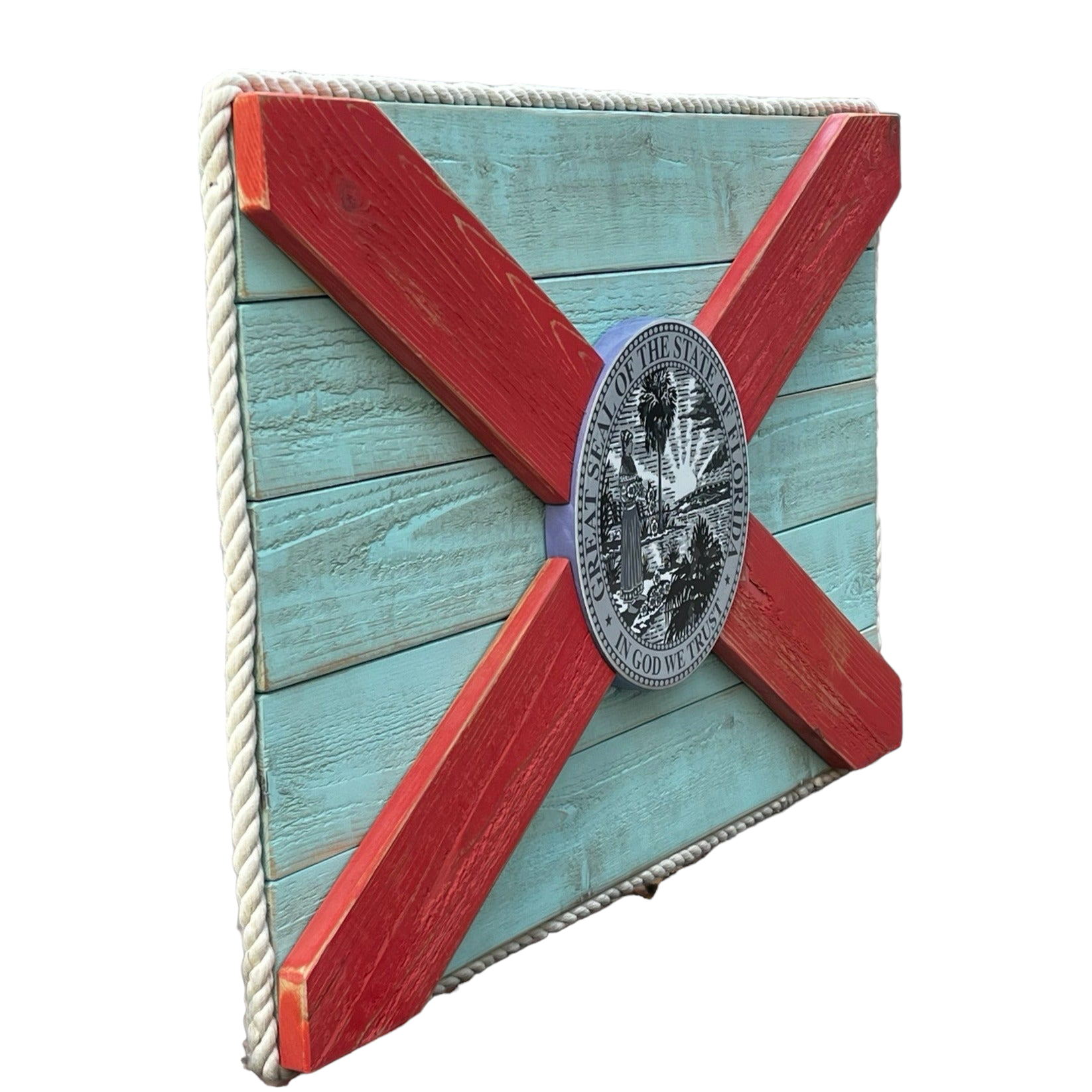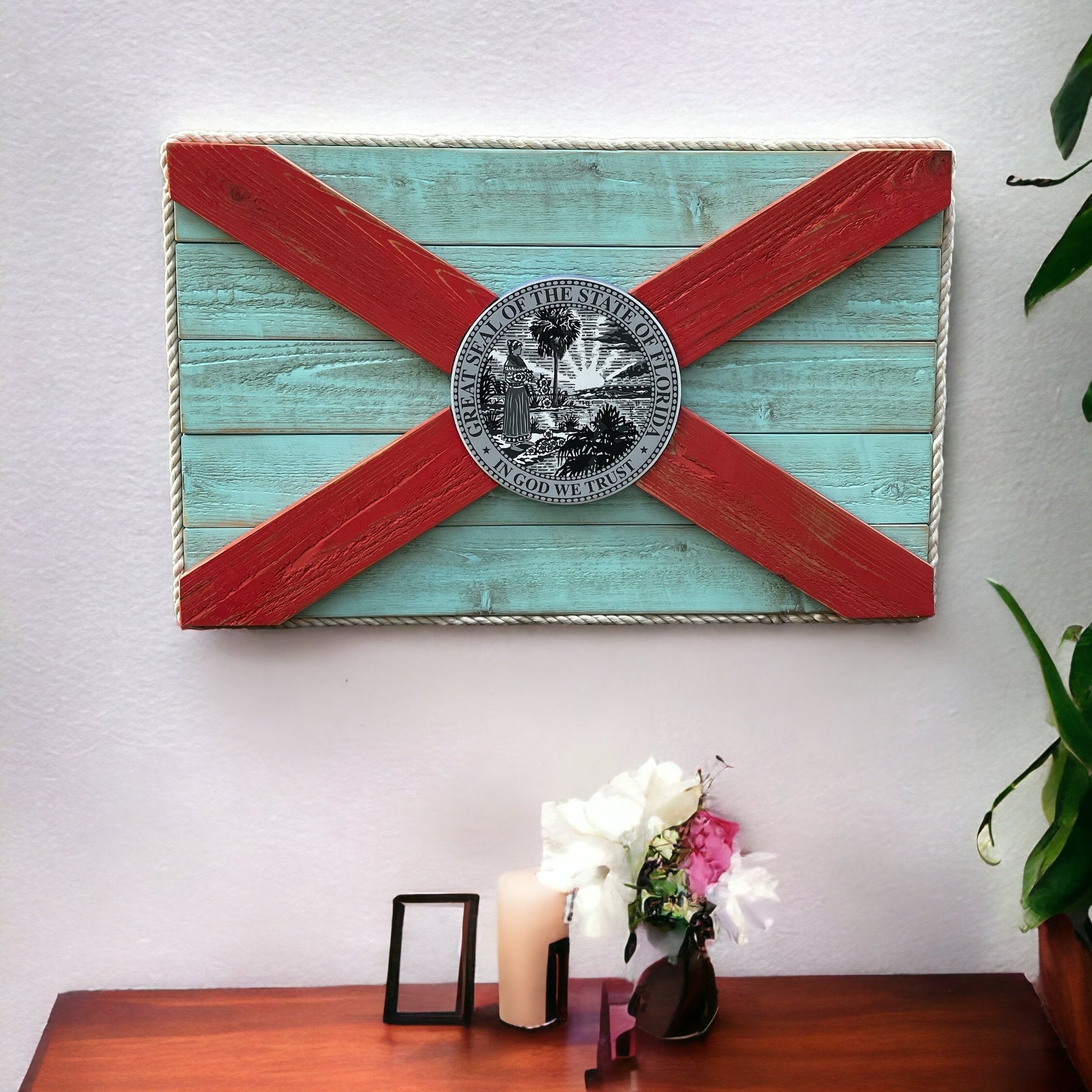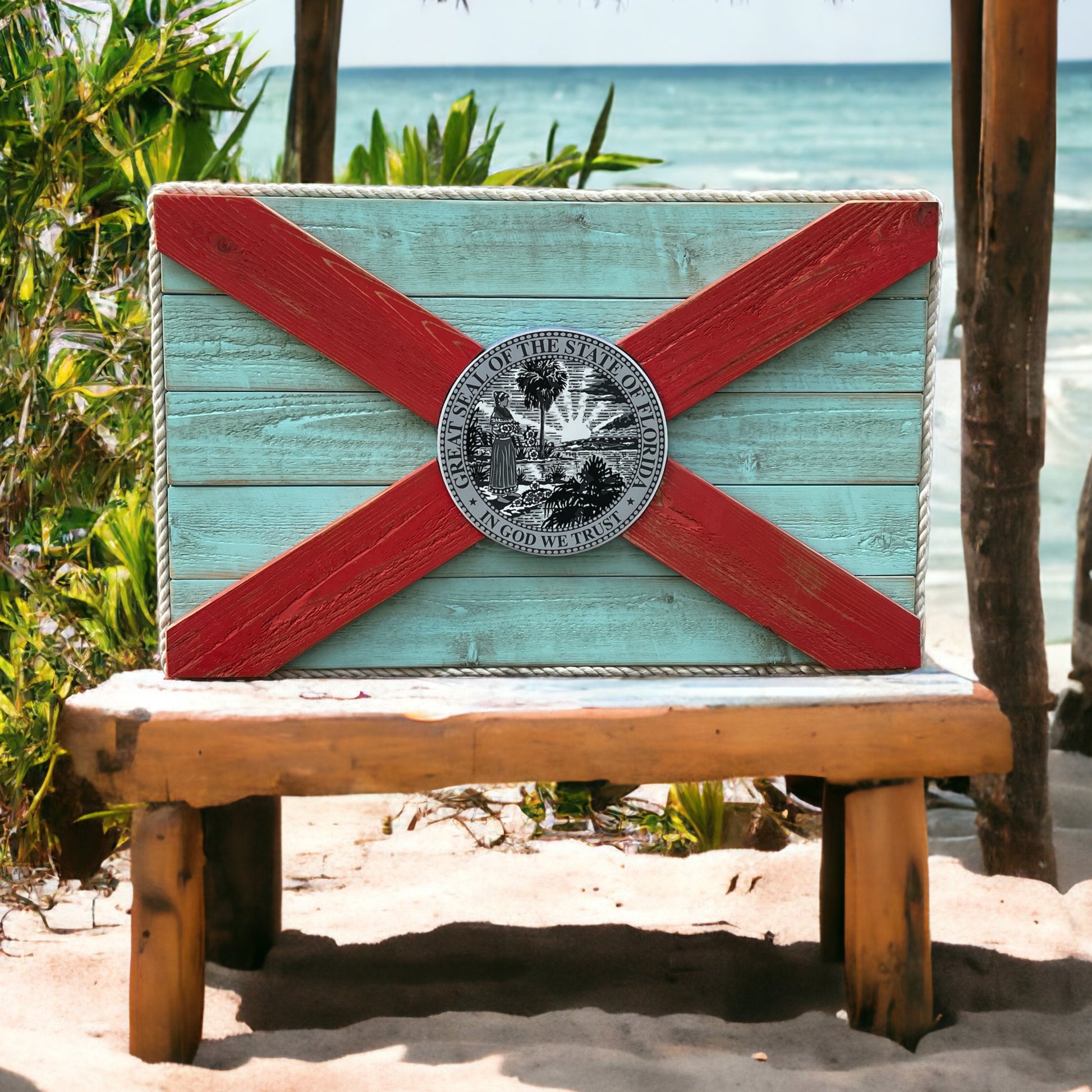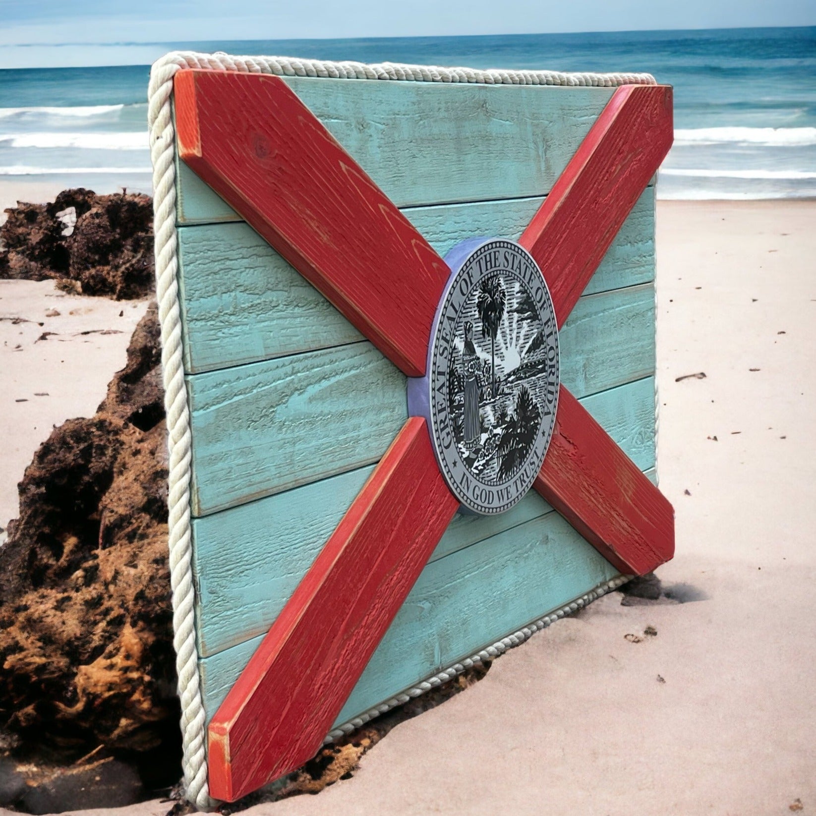 Relax in style with TropicGal, a Florida flag made from white cedar wood, and painted with a blend of colors so vibrant, it'll turn your patio into paradise! Show off your state pride with a piece that truly captures the beauty of the Sunshine State.